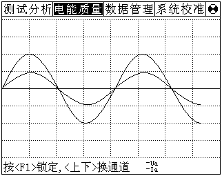 在此屏中可显示出当前各个被测模拟量的实际波形,波形实时刷新,能直观的显示出被测信号的失真情况(是否畸变、是否截顶),当前显示为Ua、Ia的波形 , 用↑↓键来切换不同的相别;可切换为B相电压、电流的波形,C相电压、电流的波形,A、B、C三相所有的电压和电流的波形。可以做为简单的示波器使用。