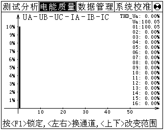 到,我们在柱状图里只显示到50次。UA-UB-UC-IA-IB-IC提示当前测量通道(可通过←、→键来改变所选通道),纵坐标刻度0%-10%表示各次谐波分量的百分比含量,基波含量始终对应到100%刻度(当所有次数的谐波含量都小于10%时进行放大显示,即以10%做为满刻度;当有一项以上的谐波含量大于10%时,以正常刻度显示,即以100%做为满刻度),横坐标的指示的是谐波的次数,右侧数值显示总谐波畸变率THD、有效值和2-64次各次谐波的数值(用上下键来翻页)。无失真的信号应显示第一次谐波(基波)。测试时用Ua、Ub、Uc三个电压通道和Ia、Ib、Ic三个电流通道进行测量。