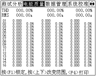 此屏显示各相电流信号中各次谐波的含量(从左到右依次表示A、B、C各相电流),其中THD为各相的电流波形畸变率(即总谐波失真度),RMS为各相的电流有效值,01次为基波电流(用实际幅值表示),以下依次为其它各次谐波的数值,以有效值形式和基波的百分比两种形式表示,以表格的形式显示1-64次电压谐波。可通过↑↓键来切换(01-16)次、(17-32)次(33-48)次、(49-64)次谐波含量的表格。按F4键打印(当数据超差时,打印数据反黑显示)。