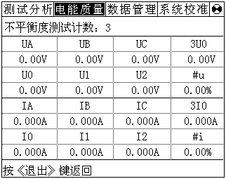 此屏显示三相电压幅值UA、UB、UC和3倍零序电压3U0、零序电压U0、正序电压U1、负序电压U2、电压不平衡度#u;三相电流幅值IA、IB、IC和3倍零序电流3I0、零序电流I0、正序电流I1、负序电流I2、电流不平衡度#i。顶端显示计数次数,每三个计数周期刷新一次数据。按F4键打印。