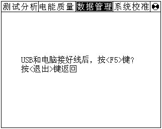 本界面用作将内置大容量数据存储卡与计算机相连的功能,仪器可直接做为USB存储设备使用。注意:一定要将USB接口通过专用连接线(不是普通的USB数据线)与电脑相连接后,才可按F5键进行联机操作,否则可能会造成长期等待的死机现象,那样必须关机才能结束死机。