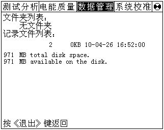 磁盘查阅界面如图二十所示。此功能屏用来查看仪器内部存储器的内容,包括存储文件的名称、大小,总的磁盘容量和剩余的可用存储空间。