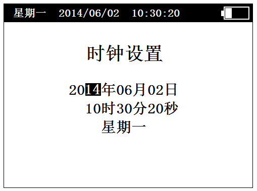 在“主菜单”屏下选中“时钟设置”选项,按“确认”键进入“时钟设置”屏(见图九)。