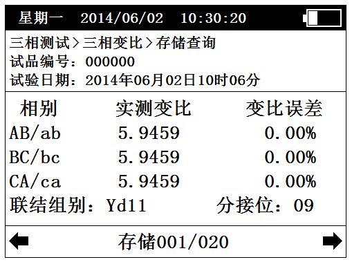 存储001/020:001表示当前查询的存储数据的位置,即第几条存储记录,其中001表示最新的存储记录。020表示共存储了多少条测试记录。