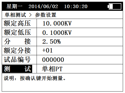 由于“单相PT”的测试数据可以进行蓝牙上传,所以在测试前需要进行“蓝牙上传设置”;“单相CT”、“单相变压器”的测试数据不能进行蓝牙上传,所以按“确认”键可直接测试。