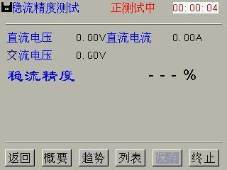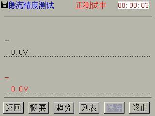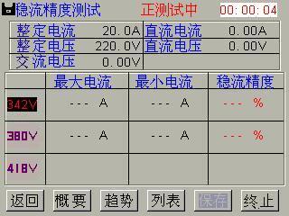 点击概要键,以概要方式显示结果,如图 4-3-3。第一行从左到右依次为直流电压和直流电流,第二行稳流精度。如果某一稳流精度超出了规定值,系统会用红色显示该值以提示用户。界面上中部显示当前测量状态,界面右上角显示当前测量持续时间。