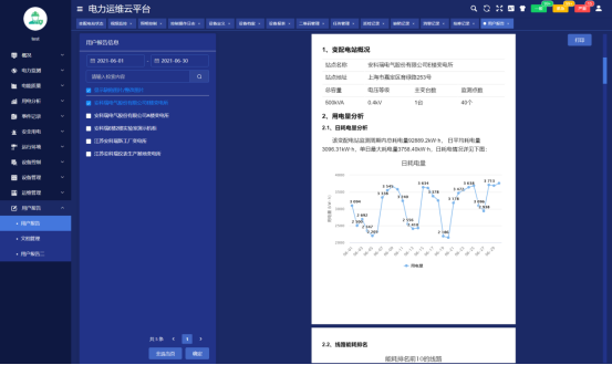 用户报告页面主要用于对选定的变配电站自动汇总一个月的运行数据,对变压器负荷、配电回路用电量、功率因数、报警事件等进行统计分析,并列出在该周期内巡检时发现的各类缺陷及处理情况。