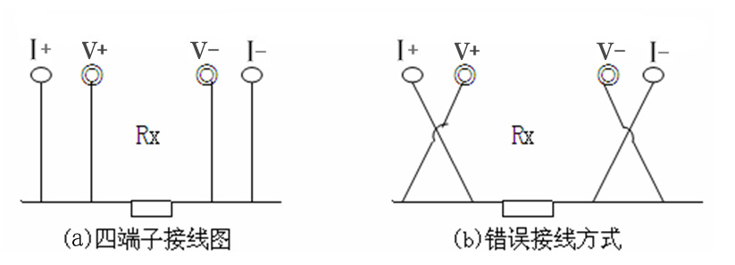 由电流源经“I+、I-两端口(也称I型口),供给被测电阻Rx电流,电流的大小有电流表I读出,Rx两端的电压降“V+、V-”两端口(也称V型口)取出,由电压表V读出。通过对I、V的测量,就可以算出被测电阻的阻值。