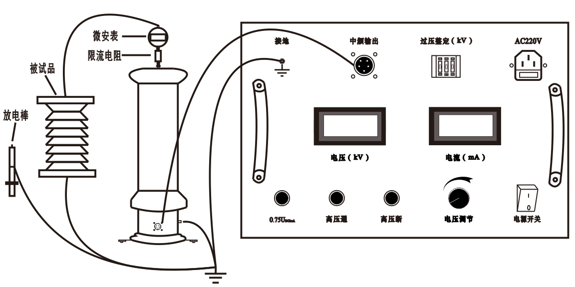 3、试验前检查直流高压发生器控制箱、倍压筒和试品的接地线是否接好。试验回路接地线应按本说明书所示一点接地。