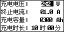 按↑/↓方向键,可以查看充电设置的参数。当查看到6个电池电压的数据极其电池号后,再按↓方向键则会显示设置的参数,界面如下:
