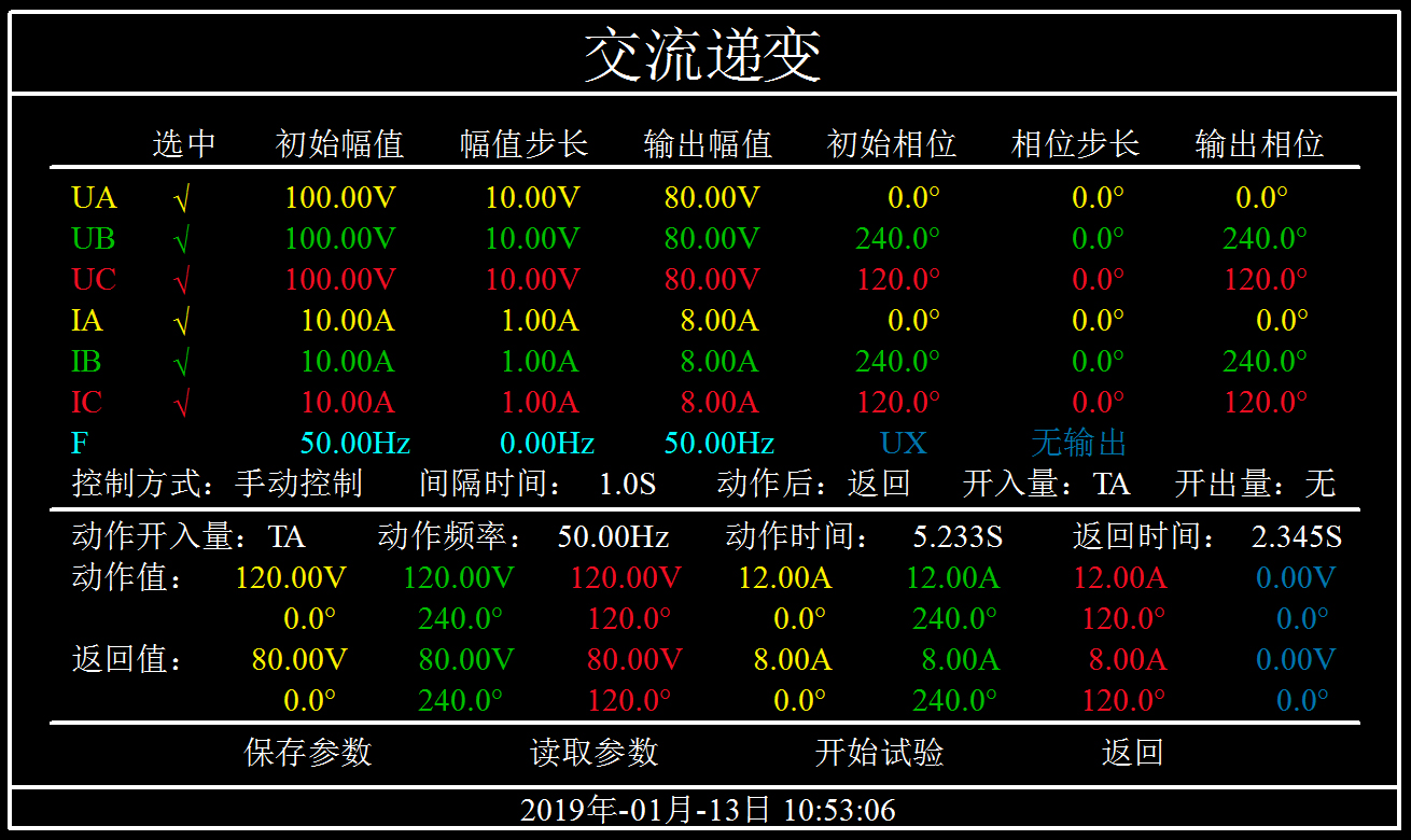 开始试验:确认连线无误后,开始试验。试验过程中,若有开入量接点状态改变,则程序将在信息栏中显示动作的开入量、动作频率、所使用的输出通道动作时的幅值和相位。