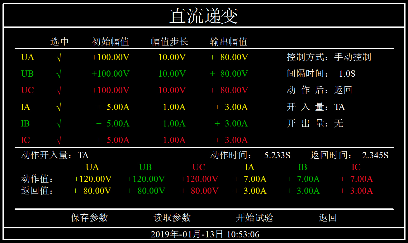 试验说明:直流递变试验可以测试直流继电保护装置的动作值、返回值和动作时间。直流递变中,各相电压电流均输出直流量,各电压电流的幅值、极性均可任意调节。试验过程中继电器和保护接点动作时,可以记录动作开入量、动作时间、动作值、返回时间、返回值等。直流递变界面如下图所示: