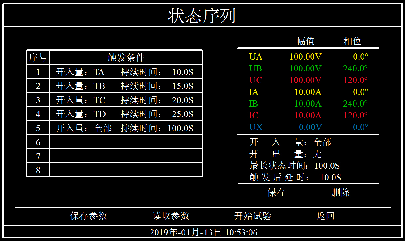 试验说明:状态序列中,可由用户定义最多8个试验状态,每个状态都可以同时输出4相交流电压、3相交流电流,输出电压、电流频率为50Hz,每个状态都可以设置不同的开入量和开出量。状态序列界面如下图所示:
