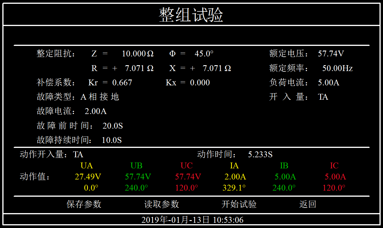 试验说明:整组试验可以模拟电力系统中的单相接地、两相接地、两相相间和三相短路故障。整组试验界面如下图所示: