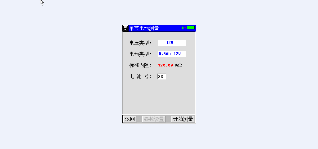 点击单节测量,输入电压类型、电池类型、电池号参数后,单击触摸屏“开始测量”按钮即可进行测量。