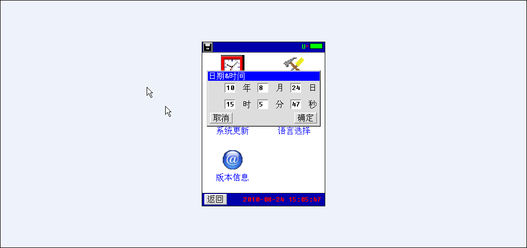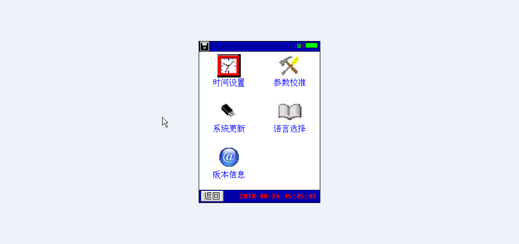 系统管理界面如下,包括时间设置、参数校准、、系统更新、语言选择、版本信息等功能