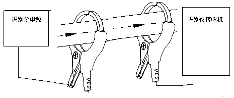 将电网输入的220VAC电源经电子技术变换为识别所需的大功率特殊信号,此信号通过专用发射钳加在待识别带电电缆的一点,根据电磁感应原理,在该电缆沿线必然产生与发射信号规律一致的感应信号,在测试现场用高灵敏的手持接收机检测测现场所有电缆,根据手持接收机指示即可准确找出所加信号之电缆(即待识别电缆)。