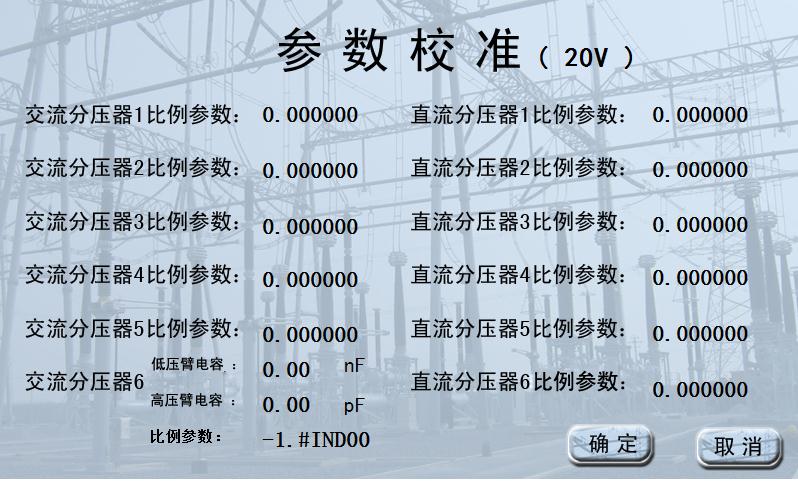 在图3正常显示界面点击“参数校准”,输入系统密码后即会进入上图所示的参数校准界面(出厂校准),直接输入参数即可改变所需要的比例值,这里特别说明一下交流分压器6比例参数设置,这只需要输入高压臂,低压臂的电容值,系统会自动算出比例参数并显示在界面上。