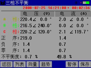 三相不平衡可用于测量三相四线电系统的电压(负序)不平衡度、电压零序不平衡度和电流(负序)不平衡度、电流零序不平衡度。