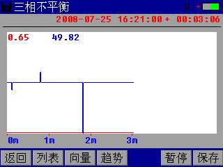点击趋势键,以趋势方式显示三相不平衡参数,如图4-3。红颜色曲线为电压不平衡趋势,蓝颜色曲线为电流不平衡趋势。趋势图曲线从左侧逐步形成,趋势图上方的读数与曲线所绘制的最新数值相对应。趋势图底部为时间轴。