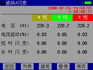 闪变可将由于电源电压变化而导致电灯亮度的波动量化表示。分析仪将电压变化的持续时间和幅度转换成受此变化引起一只60W 灯泡闪变而造成的‘不舒服系数’。闪变读数越大表示大多数人会认为亮度变化使人不快。电压变化相对要小很多。测量是在由120 V / 50 Hz 或230 V / 60 Hz 供电的灯泡上进行优化。