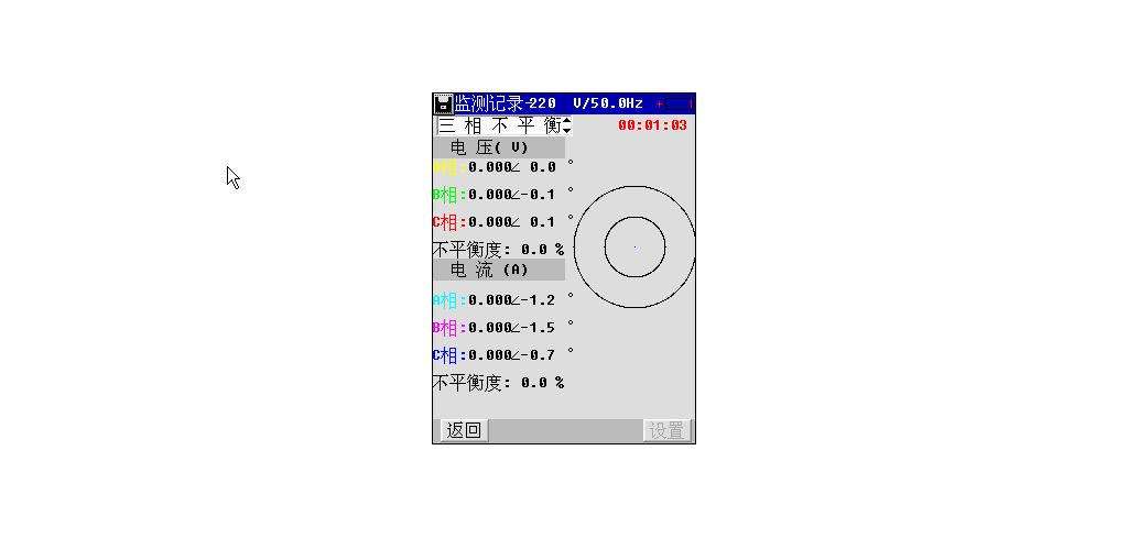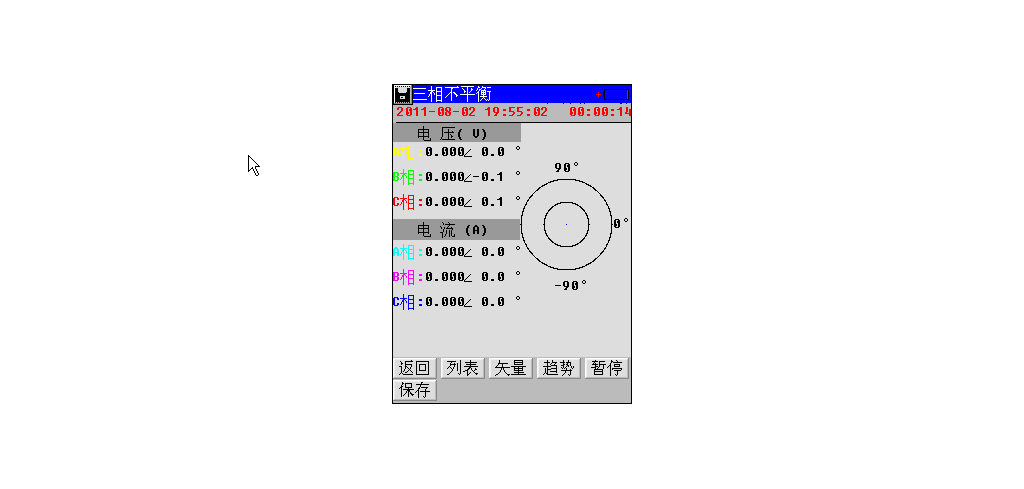 选择进入矢量菜单,以矢量方式显示三相不平衡参数,如图4-1。第一列从上到下依次为A相电压、B相电压、C相电压、A相电流、B相电流和C相电流。第二列从上到下依次为A相电压相角、B相电压相角、C相电压相角、电压不平衡度、A相电流相角、B相电流相角、C相电流相角和电流不平衡度。最右边为向量图。所有相角都以A相电压为基准。
