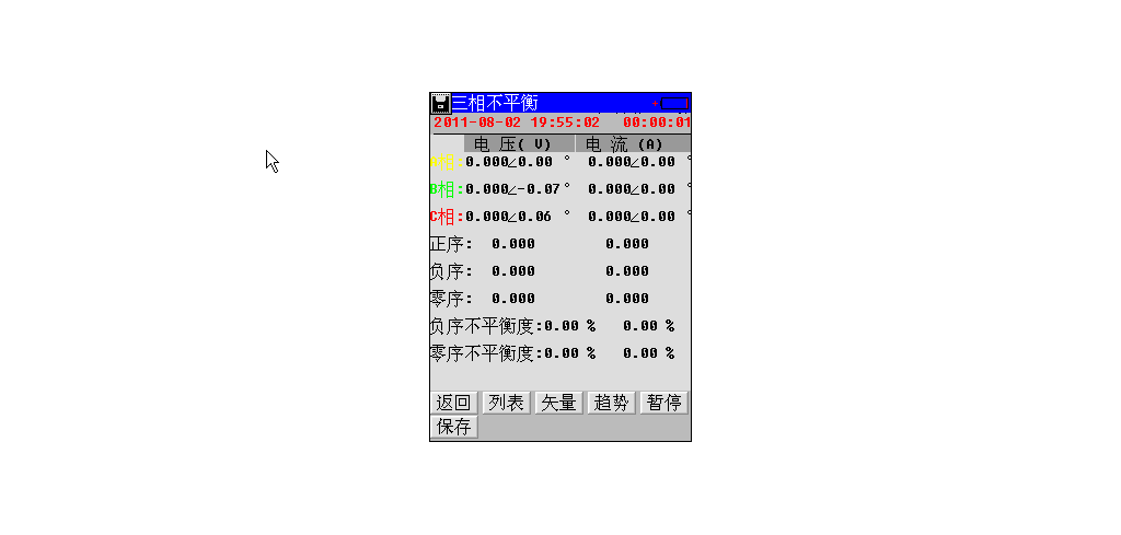 选择进入列表菜单,以列表方式显示三相不平衡参数,如图4-2。第一列从上到下依次为A相电压、正序电压、负序电压、零序电压、电压不平衡度、A相电流、正序电流、负序电流、零序电流和电流不平衡度。第二列从上到下依次为B相电压和B相电流,第三列从上到下依次为C相电压和C相电流。