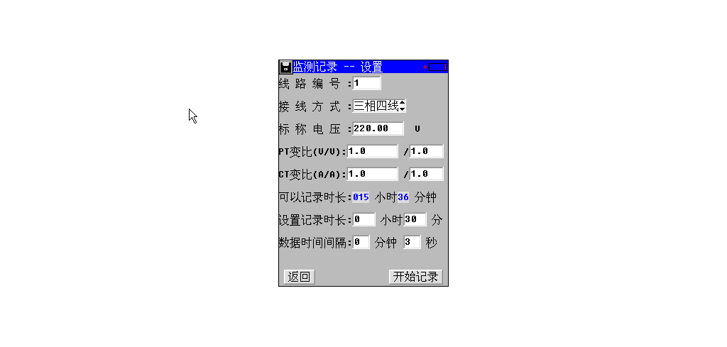 “可以记录时长”由仪表当前剩余存储空间决定。“设置记录时长”设置将要监测的时间长度,到时停止记录。“数据时间间隔”设置记录数据保存的时间间隔;另外需要设定额定电压、额定频率及接线方式。数字输入量可由软键盘数字键输入。选择好参数后选择进入开始记录键,仪表开始测量并根据设置的时间间隔对测量结果进行保存。