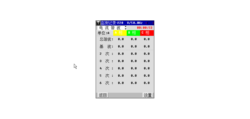 如图5-4,为监测记录电流谐波测量界面,第一列为A相电流谐波值,第二列为B相电流谐波值,第三列为C相电流谐波值,各列从上到下依次为A相/B相/C相电流总谐波值、A相/B相/C相电流基波值、A相/B相/C相电流2次谐波值至A相/B相/C相电流25次谐波值。可通过将红色方框图标移至红色小箭头上,按Enter键滚动显示各次谐波测量结果。