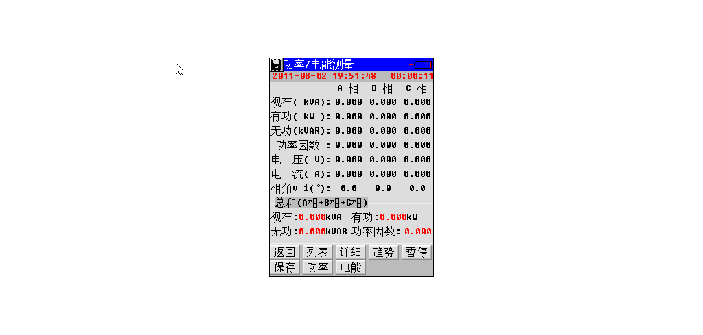 选择进入列表功能菜单,以列表方式显示功率测量结果或电能测量结果。选择进入功率或电能菜单可切换显示功率测量结果或电能测量结果。第一列为A相,第二列为B相,第三列为C相,第四列为该行值总和。在功率测量结果中,从上到下依次为三相视在功率、三相有功功率、三相无功功率、三相功率因数、三相电压有效值、三相电流有效值和三相功率因数角。在电能测量结果中,从上到下依次为三相视在功率、三相有功功率、三相无功功率、三相平均功率因数、三相有功电能、三相视在电能和三相无功电能。