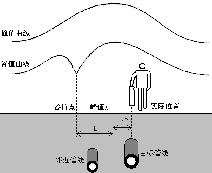 如右图所示,峰值和谷值点均偏向管线的同一侧,实际位置在峰值点的另一侧,距峰值点的距离为峰谷距离的一半。 图4-3-2 定位修正