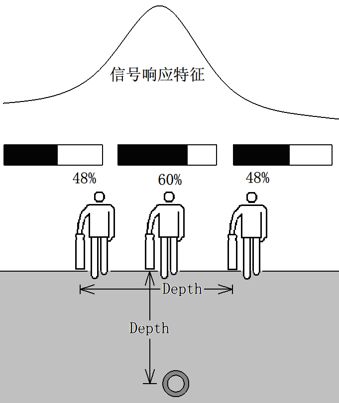 使用宽峰法(不能使用窄峰法和音谷法),找到管线上信号最强的点,按增益旋钮,自动增益调节幅值为60%;然后左右水平移动接收机,找到两个信号幅值减弱到48%的点,则两点之间的距离等于管线深度,如下图所示: