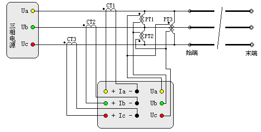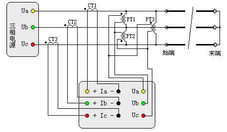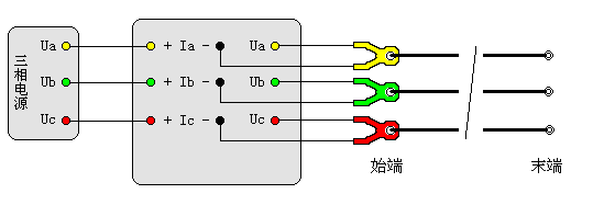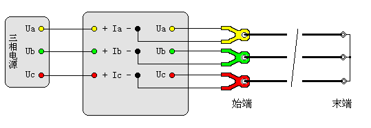 图十五中可见,线路末端三相短路(短路应有足够的接触面,并且连接牢靠,否则接触电阻影响测试结果),在线路始端加三相工频电源,仪器可测量出各相电流、三相的线电压、三相总功率,并自动测量计算出正序阻抗、正序电阻、正序电抗、正序电感。试验电源的电压和容量按线路长度