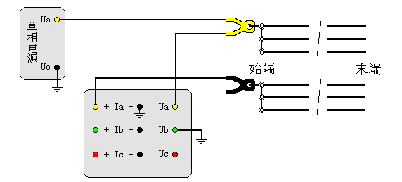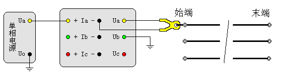 相间阻抗指的是用单相法测量任意两相线路之间的电容,例如:测量AB的相间电容,与相间阻抗测试接线基本相同,将被测线路的末端各相独立悬浮,始端在A、B两相之间加单相电源,接线如图二十三: