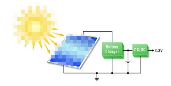 考虑一个需要3.3V电源轨的应用,提供仅几十微瓦的平均功率,峰值功率达到几十毫瓦。例如,这可以是间歇运行的远程无线传感器、酒店门锁、工业控制设备等。该设计将考虑能量收集装置(太阳能电池板),储能装置(电池),电池充电器和电压转换器。