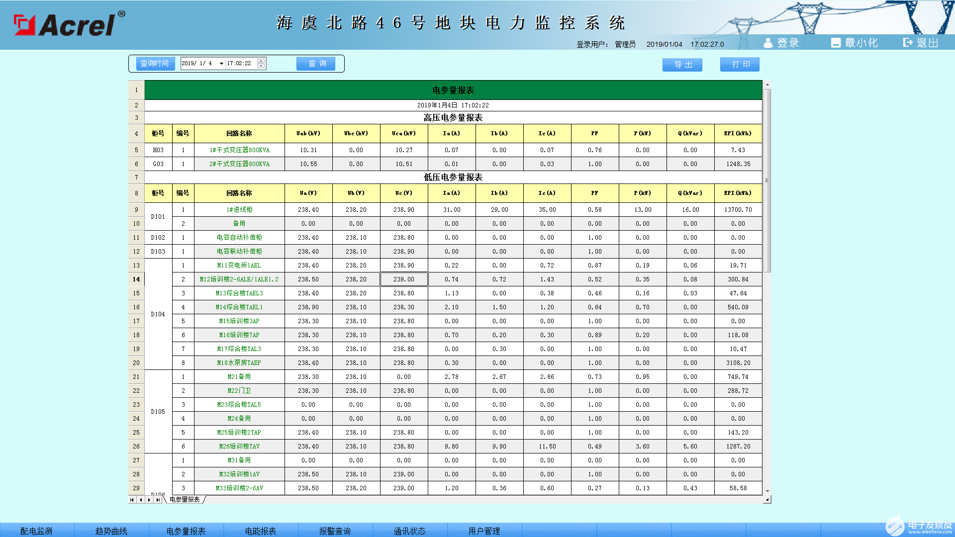 电参量报表功能,主要对高压各回路的电参数进行查询。支持任意时刻电参数查询,具备数据导出和报表打印等功能。该报表查询高压各回路的电参数,主要包括:三相线电压、电流、功率因数、有功功率和有功电度。该报表各回路名称和数据库关联,方便用户修改回路名称。见图(4)。