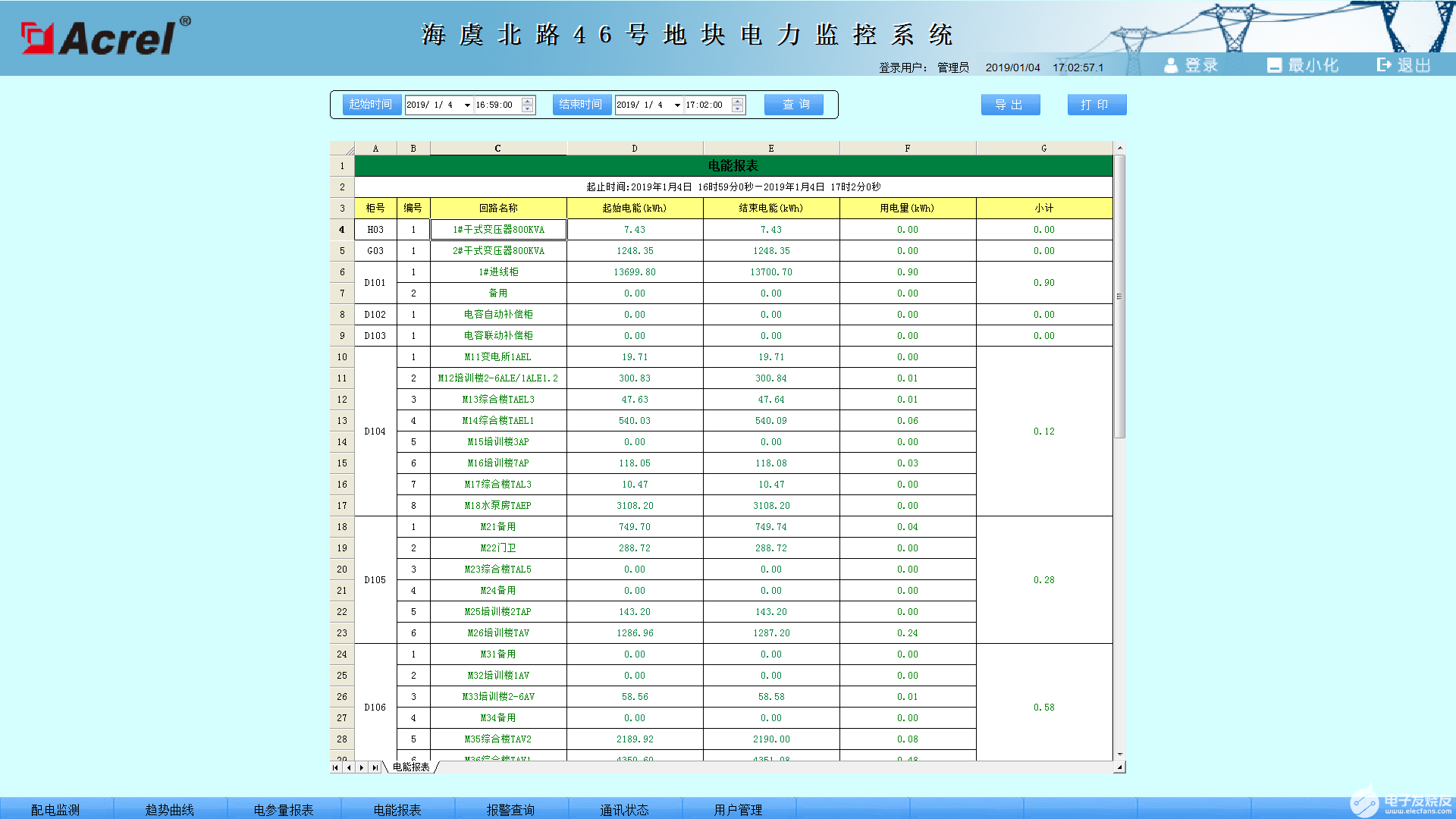 电能报表功能,可选择时间段进行查询,支持任意时间段电度累计查询,具备数据导出和报表打印等功能。为值班人员提供了精确可靠的电能报表。该报表各回路名称和数据库关联,方便用户修改回路名称。用户可以直接打印报表,可以以EXCEL格式另存到其他位置。 见图(5)。