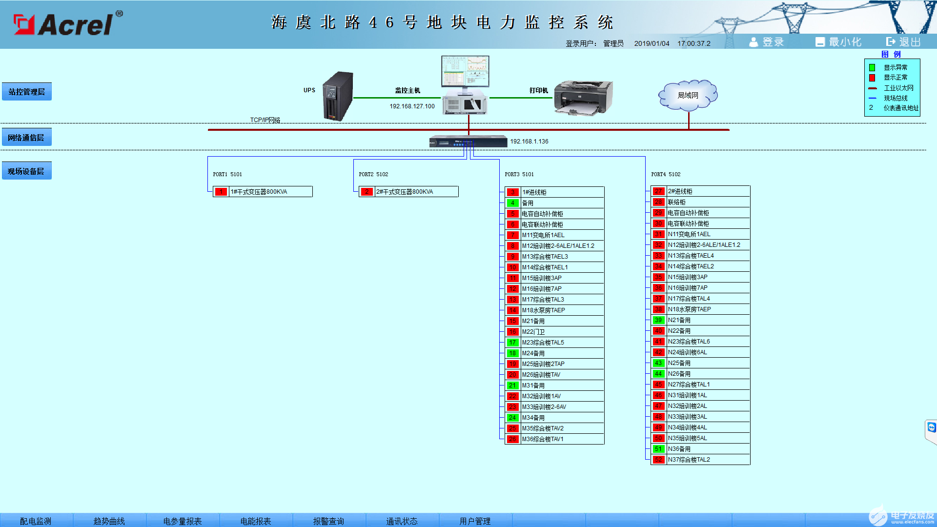 随着社会的发展及电力的广泛应用,电力监控系统已成为全国各地重点工程项目、标志性建筑/大型公共设施等大面积多变电所用户的必然选择,本文介绍的Acrel-3000电力监控系统在海虞北路46号地块项目的应用,可以实现对变电所高压配电回路用电的实时监控与电力监控,不仅能显示回路用电状况,还具有网络通讯功能,可以与通讯管理机、计算机等组成电力监控系统。系统实现对采集数据的分析、处理,实时显示变电所内各配电回路的运行状态,对分合闸弹出报警对话框,并生成各种电能报表、分析曲线、图形等,便于电能的远程抄表以及分析、研究。该系统运行安全、可靠、稳定,为变电所用户解决用电问题提供了真实可靠的依据,取得了较好的社会效益。[2]