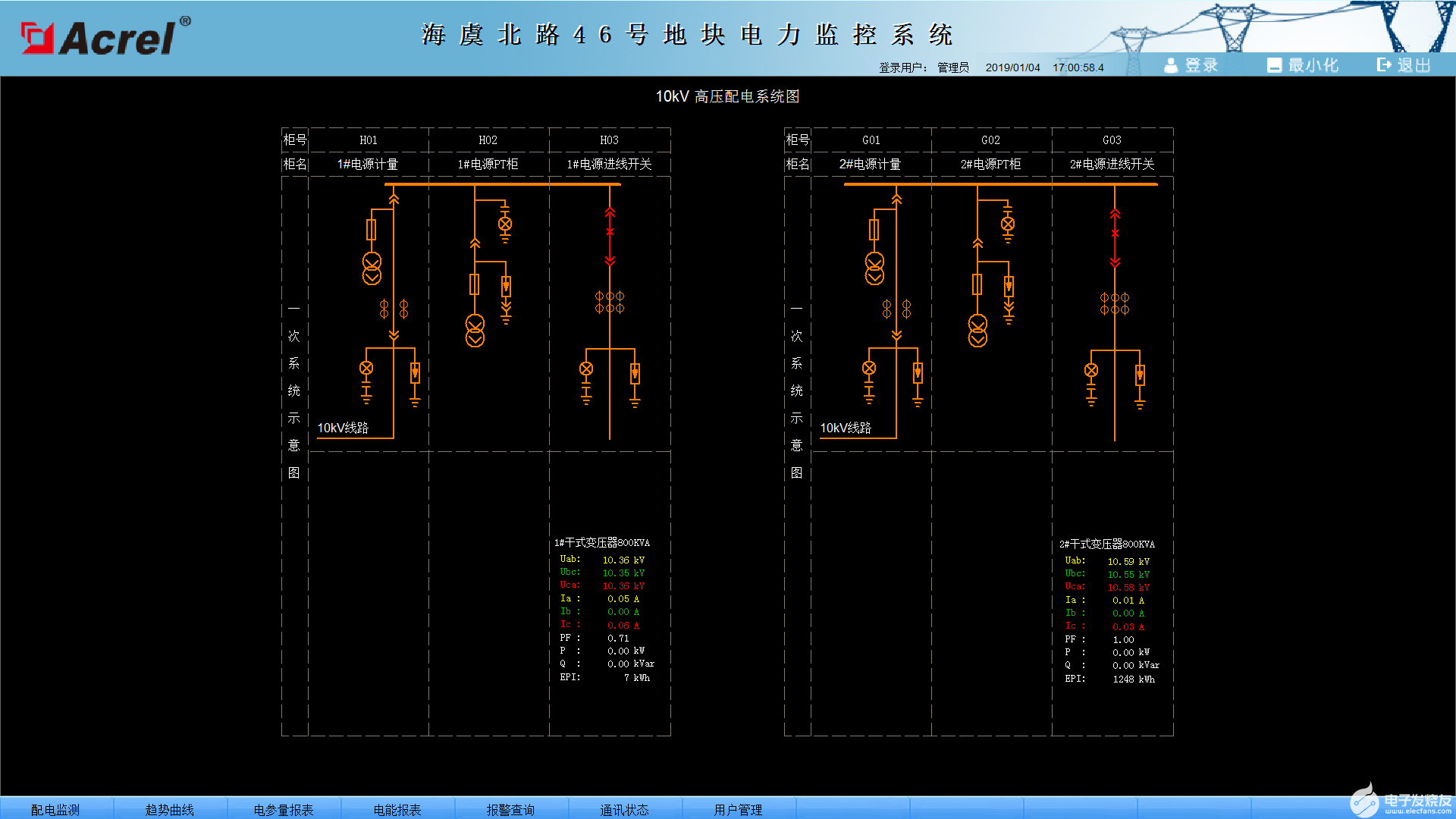 随着社会的发展及电力的广泛应用,电力监控系统已成为全国各地重点工程项目、标志性建筑/大型公共设施等大面积多变电所用户的必然选择,本文介绍的Acrel-3000电力监控系统在海虞北路46号地块项目的应用,可以实现对变电所高压配电回路用电的实时监控与电力监控,不仅能显示回路用电状况,还具有网络通讯功能,可以与通讯管理机、计算机等组成电力监控系统。系统实现对采集数据的分析、处理,实时显示变电所内各配电回路的运行状态,对分合闸弹出报警对话框,并生成各种电能报表、分析曲线、图形等,便于电能的远程抄表以及分析、研究。该系统运行安全、可靠、稳定,为变电所用户解决用电问题提供了真实可靠的依据,取得了较好的社会效益。[2]