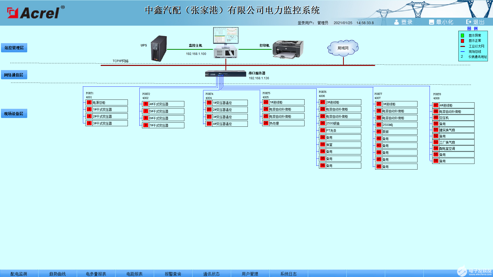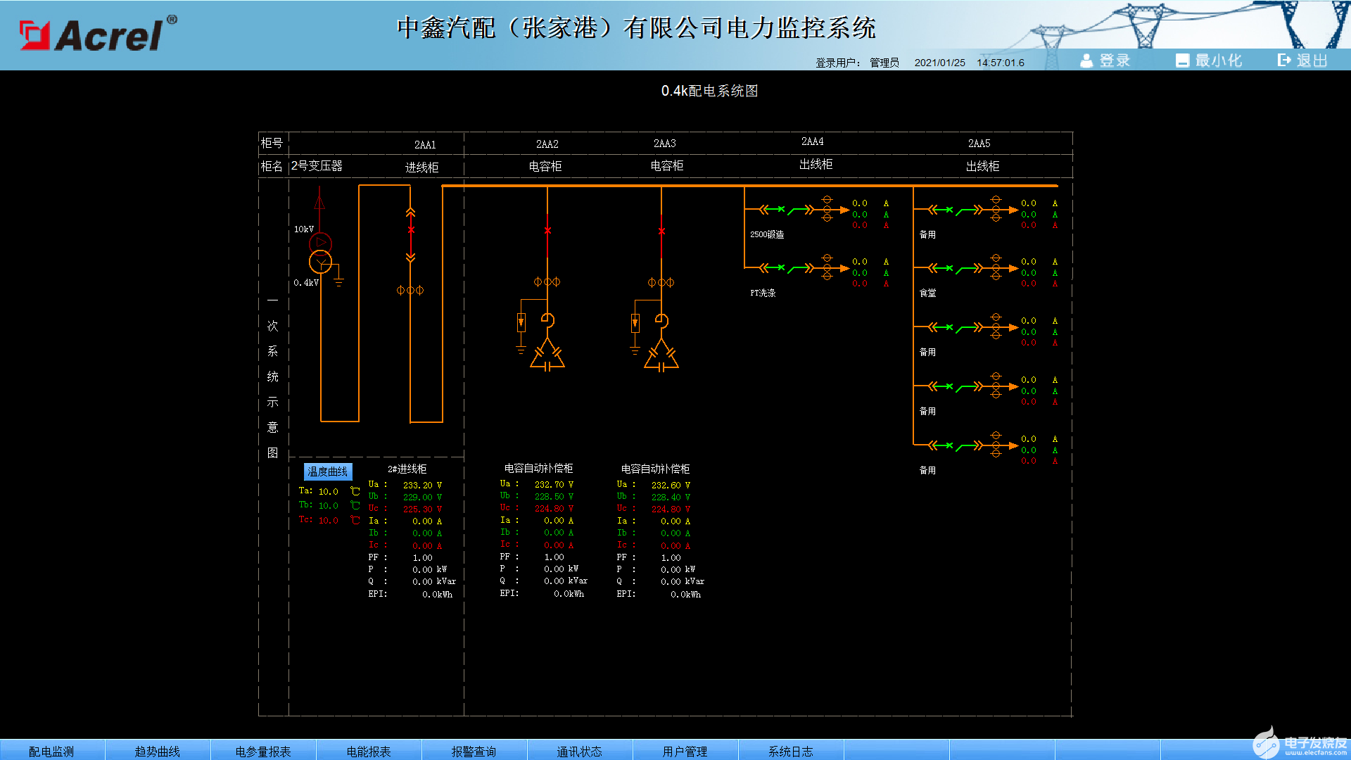 随着社会的发展及电力的广泛应用,电力监控系统已成为全国各地重点工程项目、标志性建筑/大型公共设施等大面积多变电所用户的必然选择,本文介绍的Acrel-2000电力监控系统在中鑫汽配(张家港)有限公司10kV变电所项目的应用,可以实现对变电所高压配电回路用电的实时监控与管理,不仅能显示回路用电状况,还具有网络通讯功能,可以与通讯管理机、计算机等组成电力监控系统。系统实现对采集数据的分析、处理,实时显示变电所内各配电回路的运行状态,对分合闸弹出报警对话框,并生成各种报表、分析曲线、图形等,便于电能的远程抄表以及分析、研究。该系统运行安全、可靠、稳定,为变电所用户解决用电问题提供了真实可靠的依据,取得了较好的社会效益。