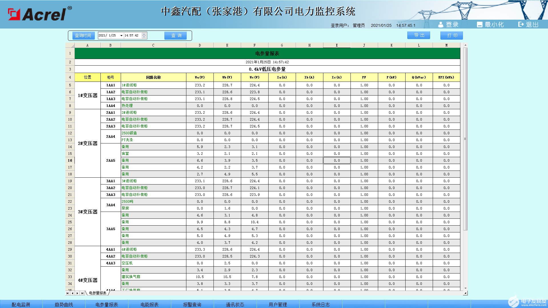 电参量报表功能,主要对高压各回路的电参数进行查询。支持任意时刻电参数查询,具备数据导出和报表打印等功能。该报表查询高压各回路的电参数,主要包括:三相线电压、电流、功率因数、有功功率和有功电度。该报表各回路名称和数据库关联,方便用户修改回路名称。见图(4)。