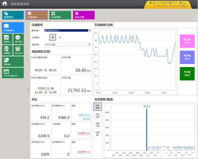 系统可以统计各分项某段时间内逐日、逐周、逐月、逐季、逐年用能。可查看分项中各支路用能趋势,可根据已有的日期或者自定义时间进行查询,统计数据可导出至Excel。