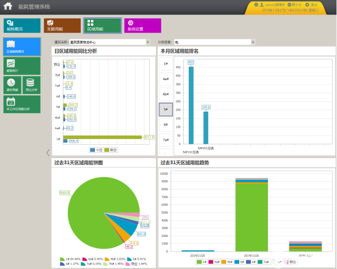 系统可以按照分项进行能耗统计与显示。其中,日分项用能同比分析图显示不同分项的当日与昨日能耗柱状图(蓝色柱表示今日,绿色柱表示昨日);用能饼图显示各分项过去31天的用能占比;堆积图显示各分项过去31天的能耗趋势;分项用能排名图显示被选中分项对应能耗值排名前10位的支路。