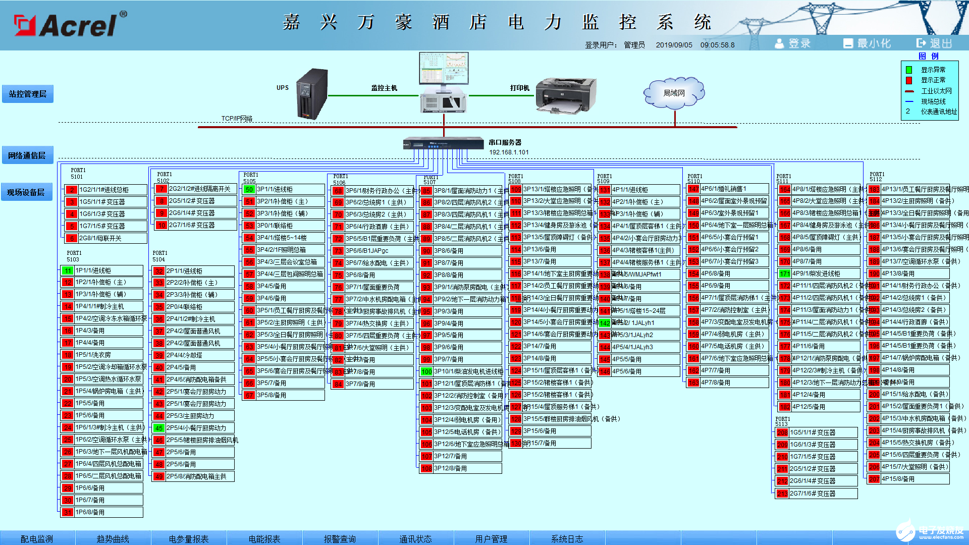 监控层包括工程师站和远动通信站,包含监控计算机、网络交换机、打印机、UPS以及Acrel-2000电能管理软件,其中软件部分具有良好的人机交互界面,通过数据传输协议读取通讯管理机采集的现场各类数据信息,自动经过计算处理,以图形、数显、声音等方式反映现场的运行状况;电能计量管理功能设计各种符合用户的报表格式,报表内数据严格按照各种标准进行计量,搭建完整的计量体系,用户只需查找打印即可,方便了操作,提高了工作效率。
