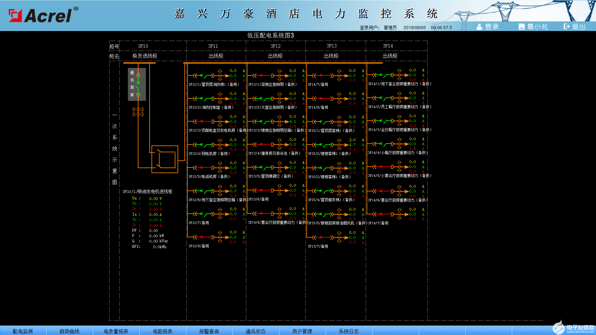监测详图反应了整个系统配电回路名称,相应的配电体系以及回路的主要电参量。通过实时数据的显示,直观反映本项目各个监测回路的运行数据,便于管理者实时了解系统运行状态。界面如图4所示。