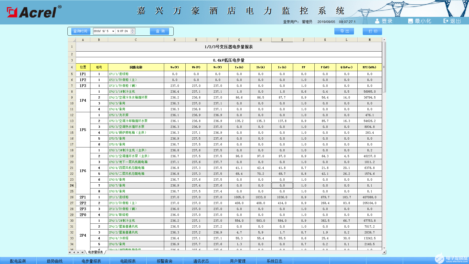 电能报表是对用电量的管理以报表形式呈现,该报表可以实现系统运行期间的任意时间段内的月抄表,日抄表,小时抄表等功能,且可以Excel形式导出或打印。界面如图6所示。