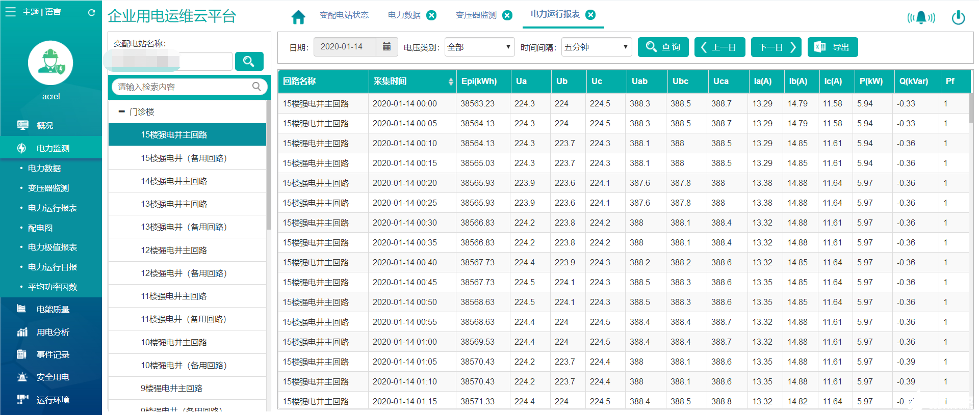 电力运行报表显示各回路分时段的电力参数和电能的实时值,如下图所示: