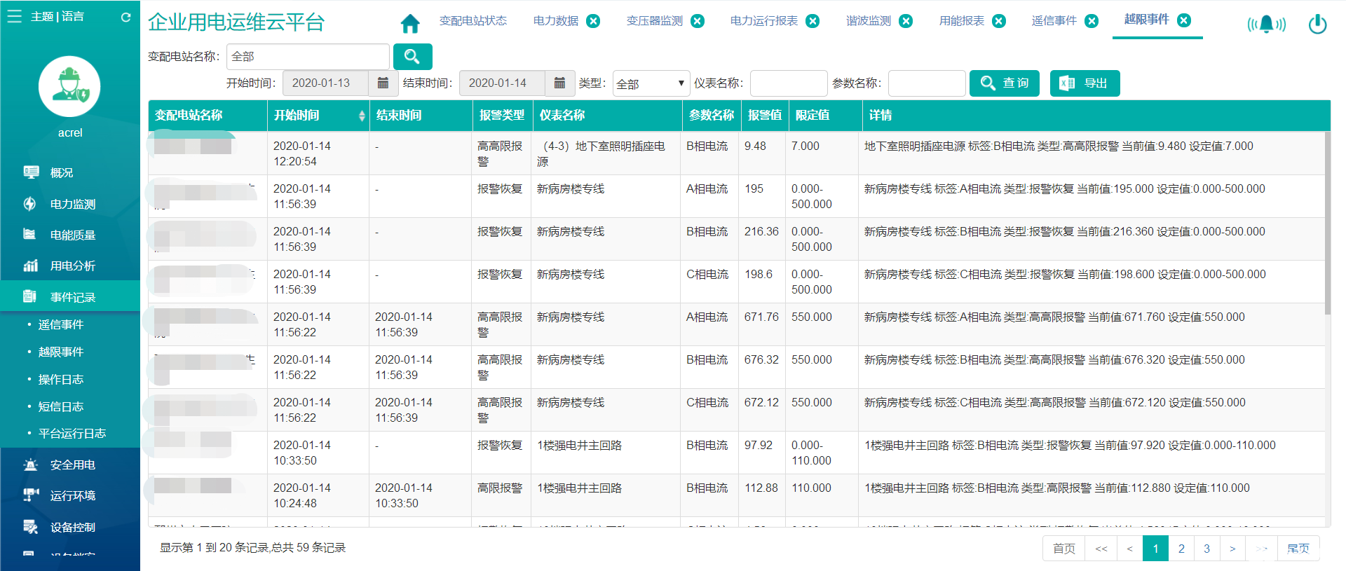 事件记录方便运维人员查看浏览断路器合分、门开门关、电流电压越限告警、短信日志、平台运行日志: