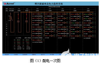 低压回路采用的ACR系列多功能电力仪表是针对电力系统、工矿企业、公共设施、智能大厦的电力监控需求而设计的网络电力仪表,它能测量所有常规电力参数,如:三相电压、电流、有功功率、无功功率、功率因数、频率、有功电度、无功电度。并且本仪表带有4路光电隔离开关量输入接点和2路继电器控制输出接点,这些接点可以配合智能断路器实现断路器的遥信、遥控操作。该系列网络电力仪表主要应用于变电站自动化、配电网自动化、小区电力监控、工业自动化、能源管理系统及智能建筑等领域。配电一次图见图(1),功能有电量遥测主要监测运行设备的电参量,其中包括:线三相电压,电流,功率,功率因数,电能,频率等电参量及配出回路的三相电流;遥信功能实现显示现场设备的运行状态,主要包括:开关的分、合闸运行状态和通讯故障报警;断路器变位时会发出报警信号,提醒用户及时处理故障。