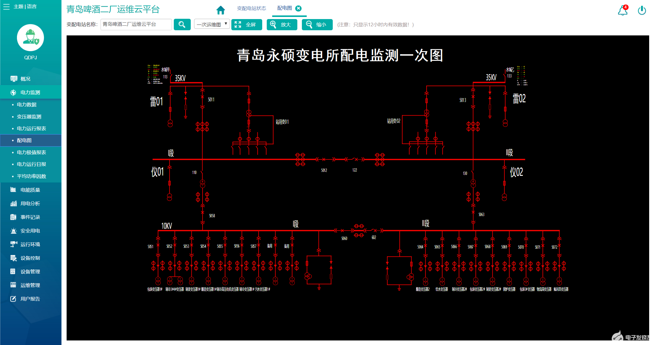 “电力监控”页面包括配电图、变压器监测、电力数据。